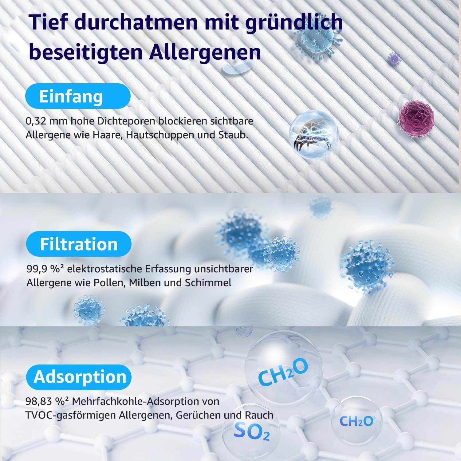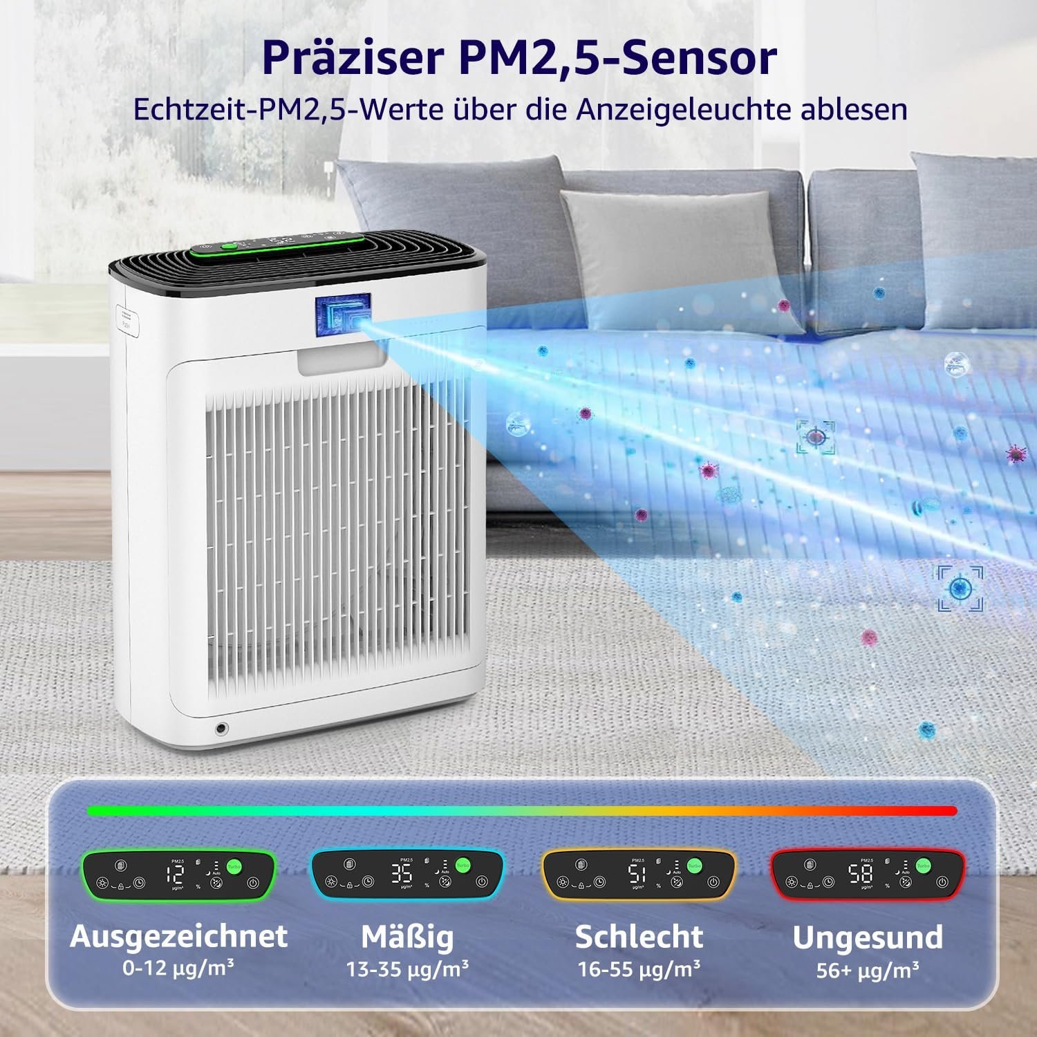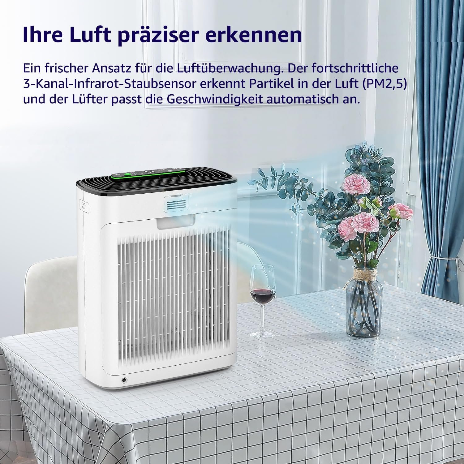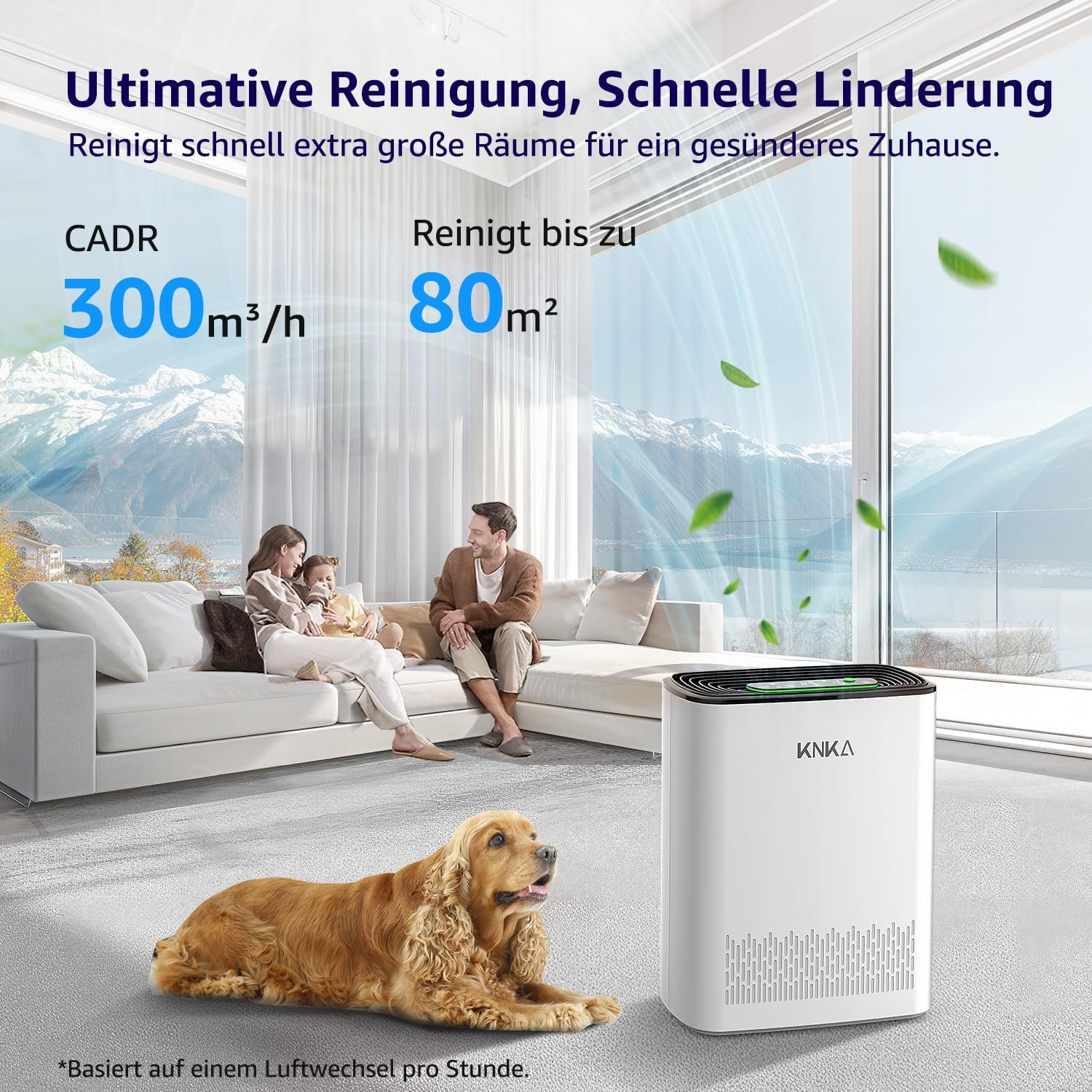 KNKA Luftreiniger H13 HEPA (bis 80m²). CADR 300m³/h gegen Staub, Pollen & Gerüche. Mit Luftqualitätssensor, Auto-Modus & Schlafmodus